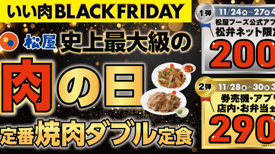 松屋は、11月24日から30日まで、ブラックフライデーと「いい肉の日」(11月29日)が重なる特別期間に「いい肉ブラックフライデーキャンペーン」を展開中。