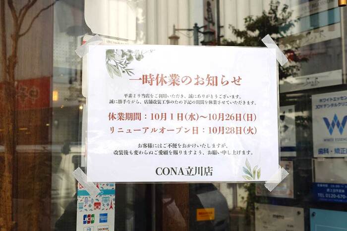 《休業》立川駅南口・諏訪通りぞいのイタリアンバル『CONA 立川店』が改装工事のため休業してる。10月28日(火)リニューアルオープン