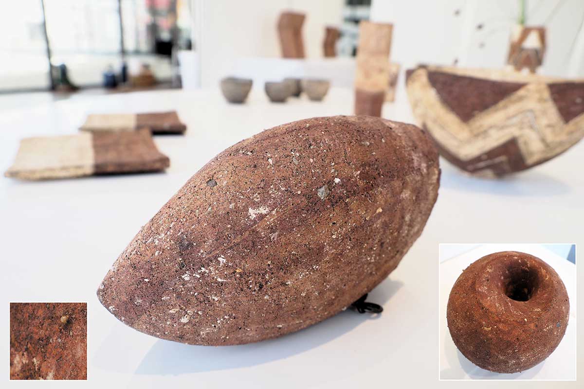 使うのは、自ら選んだ久慈市の土。山や川原などの地層から掘り出したものだ。チャート、長石などの鉱物が混じった土をあまり精製せず作陶。その土に含まれるさまざまな物質が、焼成の過程で小さな突起となって表面に現れ、独特の質感を生み出している。「石が入った、ざらざらした感じの表情に引かれる。土の採取は人に任せられない」。釉薬もほとんど用いないといい、伊藤さんは自身の作品を「プリミティブ(『原始的な』という意味)」と表現した。