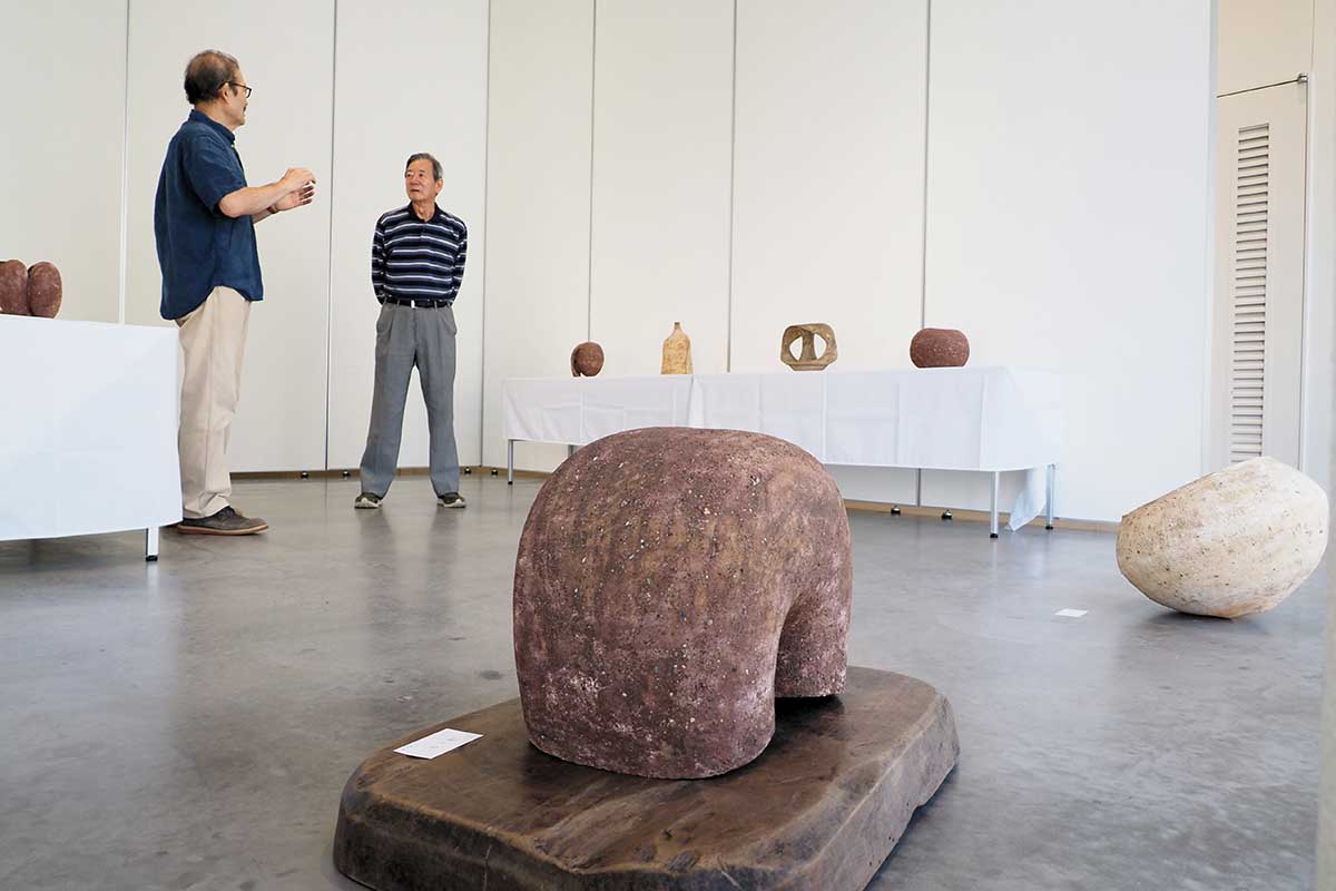 独自の造形、土の表情を見て、感じ取れるよう作品はすべて自由に触れることができた。来場者は「素朴」「土そのままで面白い」などと、つぶやきながら鑑賞。元製鉄マンらしき男性は焼き方の工程や窯内の温度など、伊藤さんに熱心に質問していた。
