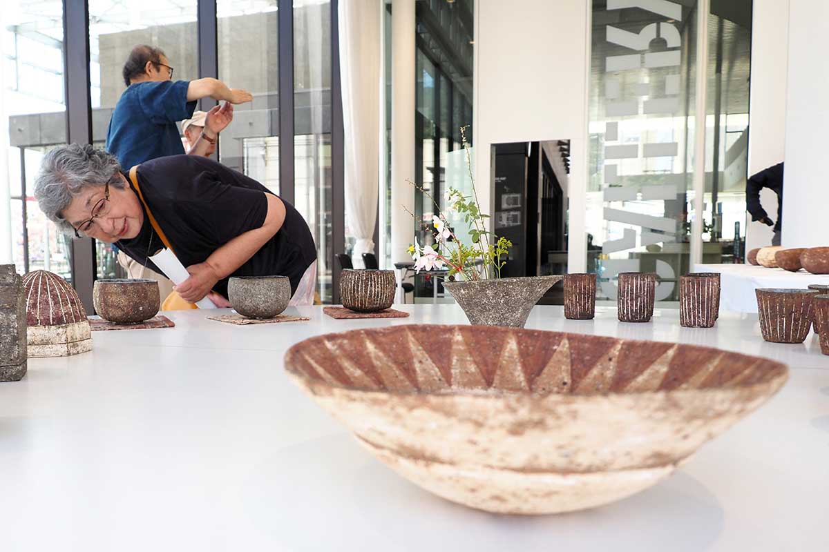 食器も、手が触れる表面はざらざらとした質感は残るが、カップや花入れなどは内側にうわぐすりが塗られ、さらりとした光沢がある。水漏れしないよう飲みやすさや使いやすさにはしっかり配慮。表面に白いカオリンという粘土を薄く塗り、焼成後にワイヤーブラシでカオリンをこそげ落とし土肌をあらわにする独自技法が隠れていて、白色と赤茶色の土のコントラストが味わい深い作品もあった。