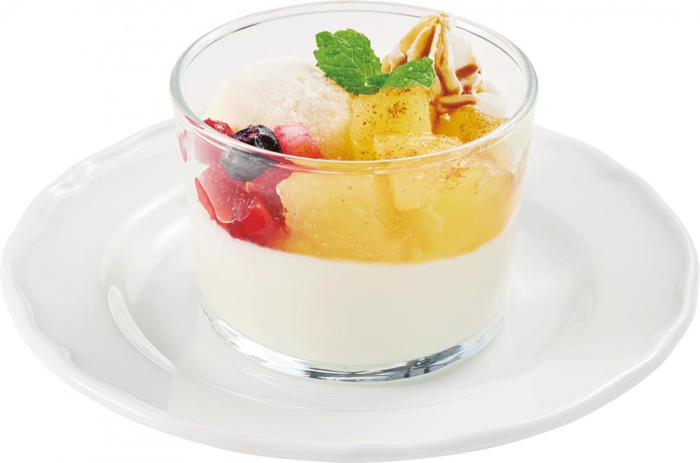 爽やかな酸味の4種のミックスベリージェラートが、リンゴのやさしい甘さを引き立てています。角切りリンゴのシロップ漬け、なめらかな食感のパンナコッタ、サクサクのクレープなど、いろいろな食感を楽しめるのがポイントです。