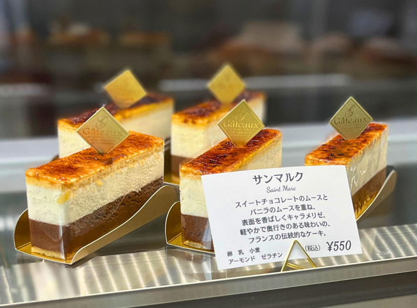 スイートチョコレートのムースとバニラのムースを重ね、アーモンドプードルを練り込んだ生地の表面をキャラメリゼした「サンマルク」(550円)。ムースのなめらかさとキャラメリゼのサクサク食感がくせになる、フランスの伝統菓子です。