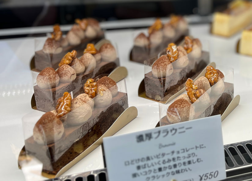 サクッと香ばしく、ほんのりもっちりとしたクッキーシュー生地に、自家製カスタードと生クリームがたっぷりとつまった「シュークリーム」(350円)と、口にいれるととろけるベルギー産のビターチョコレートに香ばしいくるみをトッピングした「濃厚ブラウニー」(550円)。