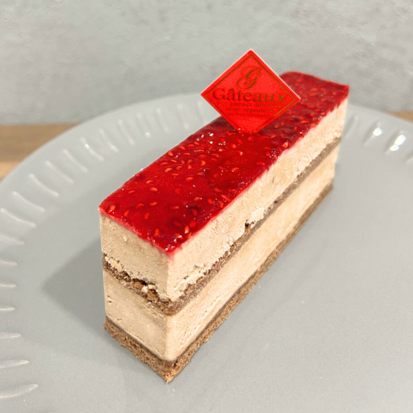 「ルビー」(680円)は、フランス修業時代に師匠から教えてもらったレシピ・技術を守って作っている、店主思い出のケーキ。サクッとしたチョコクリスピー生地に、なめらかなベルギー産のチョコレートを使ったキャラメルチョコレートムースを重ね、フランボワーズのコンフィチュールで仕上げた看板メニュー。
