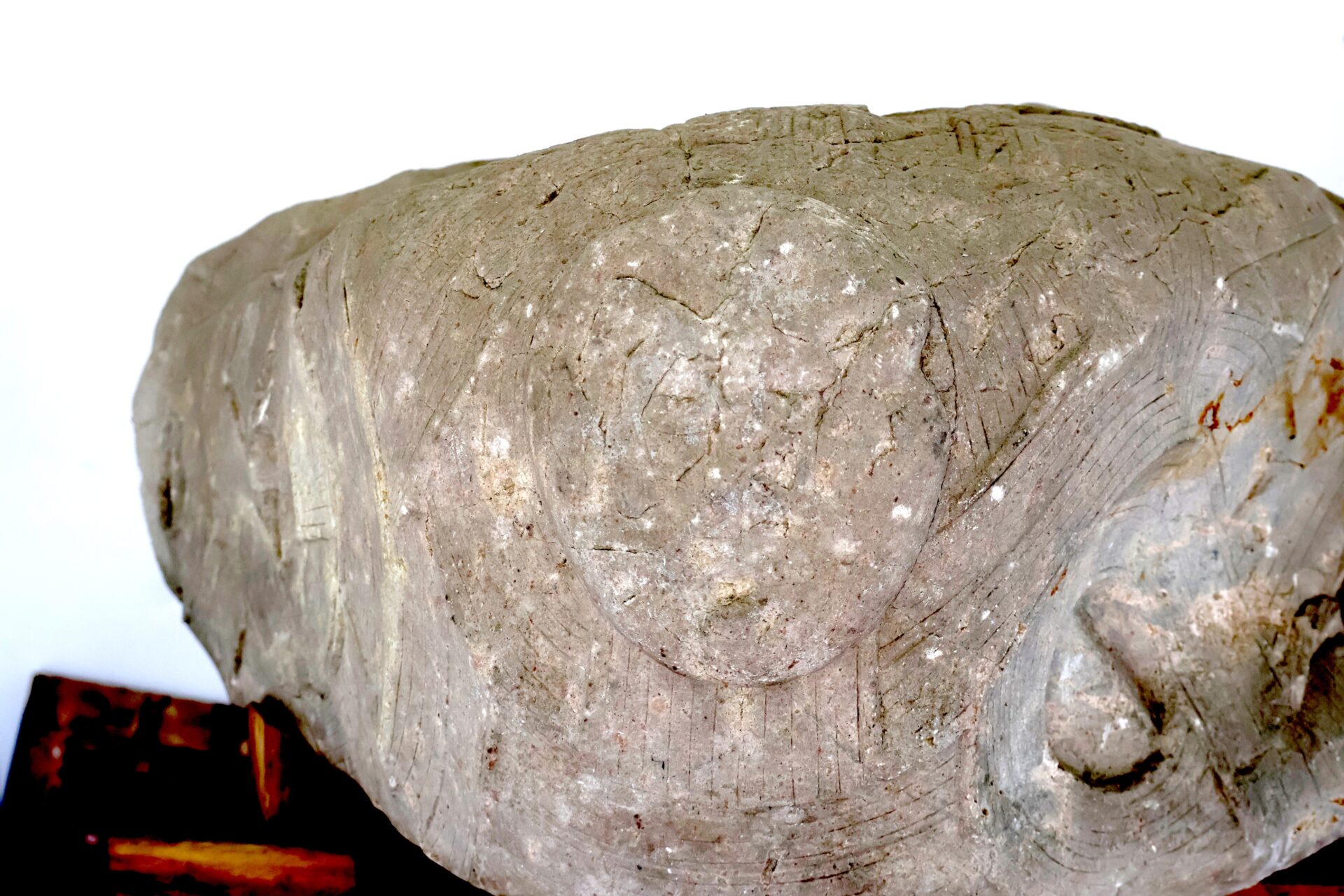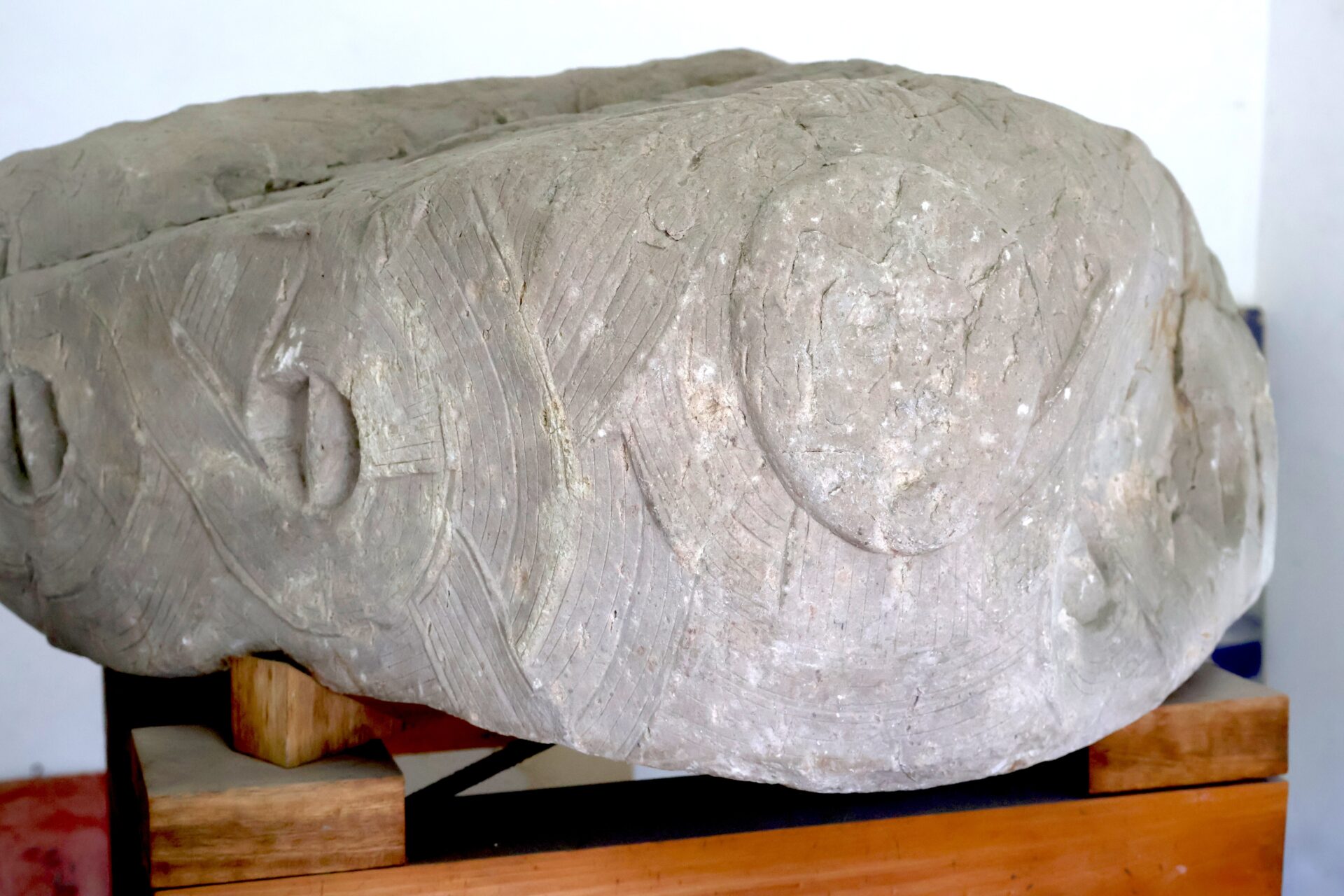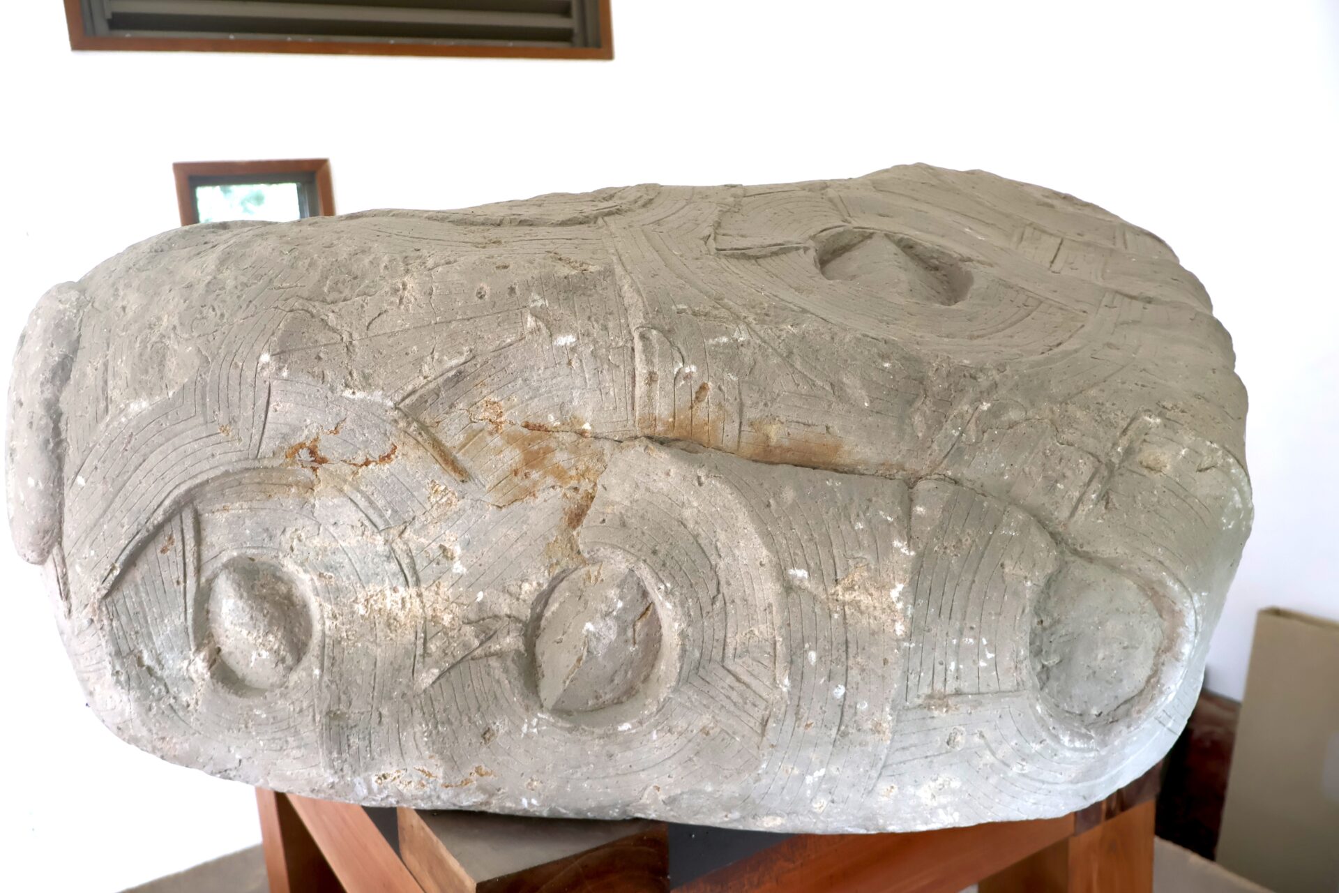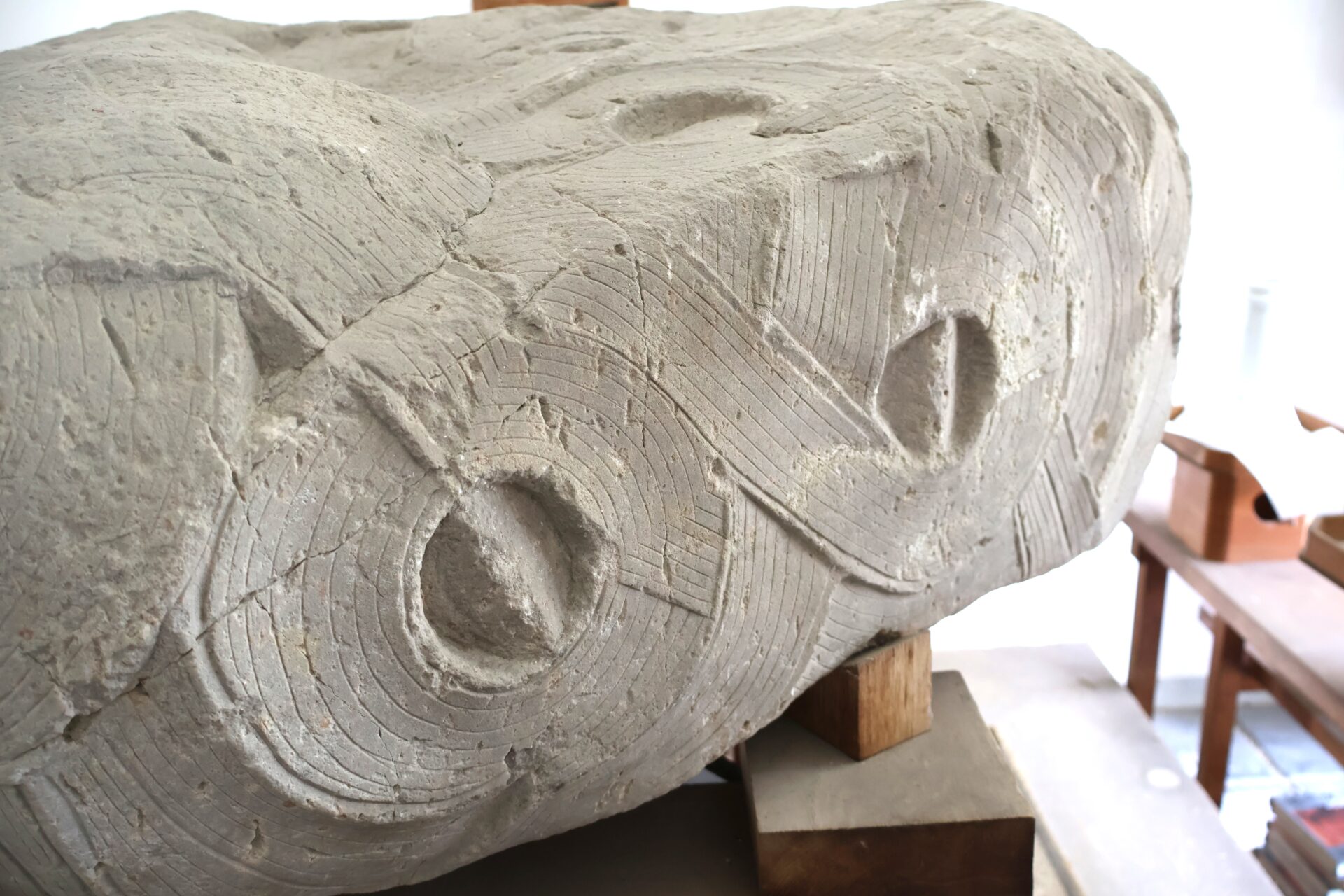 円丘のすぐ近くの収蔵庫に、顔のように見える彫刻が施されている石が静かに安置されています。これは国の重要文化財「旋帯文石」です。その文様の形から「弧帯文石(こたいもんせき)」とも呼ばれています。