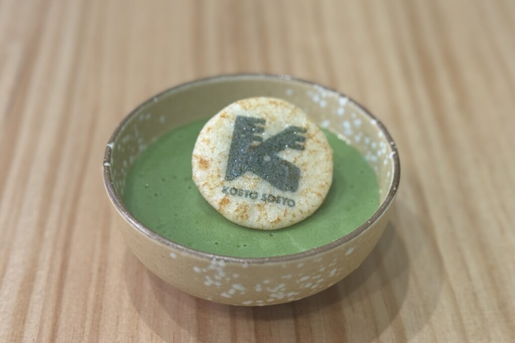豆乳と宇治抹茶で仕上げた優しい甘さのプリン。あまからせんべいの下にはこしあんが隠されており、甘みと塩気のバランスが絶妙です。