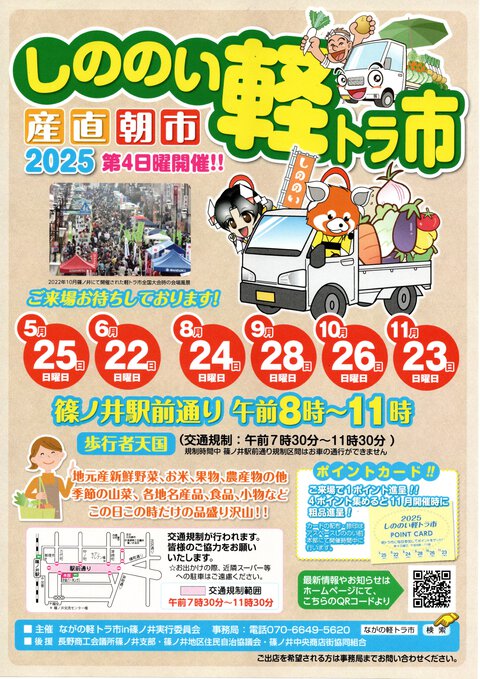 5月、6月に続いて今年3回目の開催となる人気イベント。日曜の午前、歩行者天国となった篠ノ井駅前通りに、たくさんの農産物などを積んだ軽トラが集結します。生産者とコミュニケーションが取れるのも魅力の一つ。「産直」の良さが実感できます。