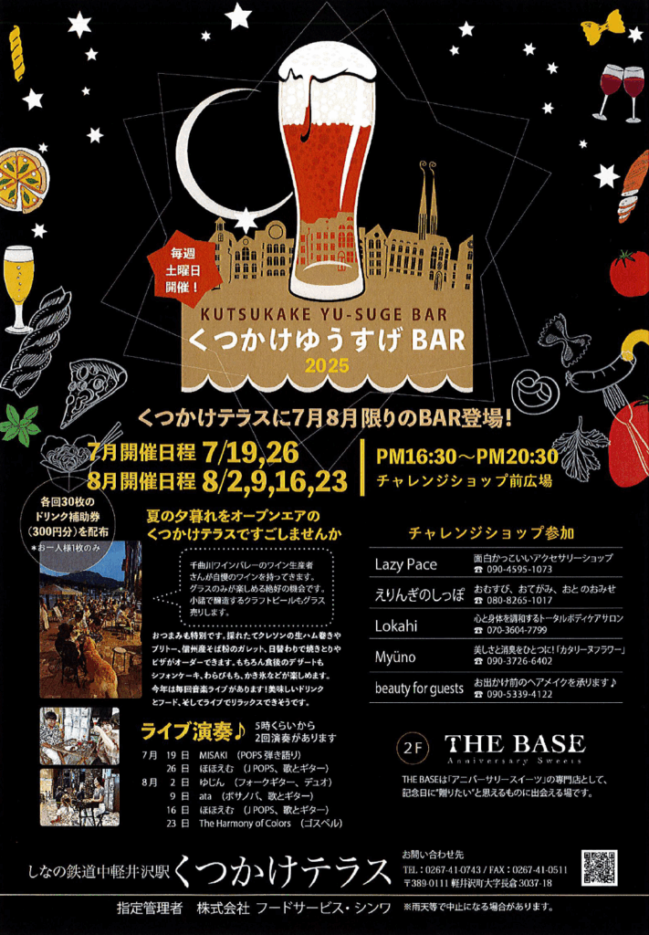 夏の夕方から夜にかけて、中軽井沢駅前を「オープンテラス居酒屋」にするイベント。今年最後の開催です。出店者は東御市と立科町のワイナリー、小諸市のクラフト生ビール、ソーセージやガレット、ガパオライス、自家製酵母パン、イタリア菓子、シフォンケーキ、わらびもち、コーヒーなど。30枚のドリンク補助券(300円分)を会場内で配布します(1人1枚)。
