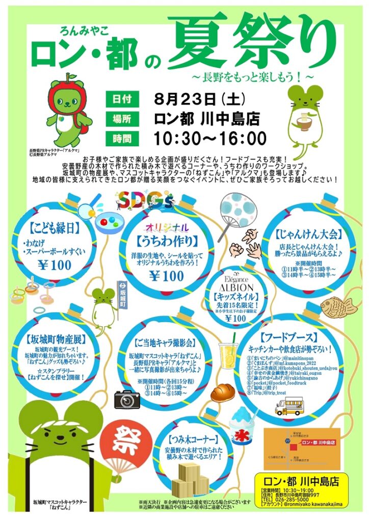 長野市の「ロン・都 川中島店」で、地域の魅力を発信し、親子の笑顔をつなぐ「夏祭り」が開催されます。坂城町の物産展があるほか、長野県と坂城町の観光PRキャラクター「アルクマ」と「ねずこん」が登場!一緒に写真撮影ができます。子どもたちが喜ぶ縁日コーナーや、オリジナルうちわ作りのワークショップ(洋服の端切れを再利用)など、“遊びながら学べる”体験も。キッチンカーも多数出店予定で、阿智村の牛乳を使用した商品や、かき氷、たい焼き・唐揚げなど、充実のラインナップです。「地域と共に楽しむ、ロン・都の新しい取り組み」を体験しましょう。