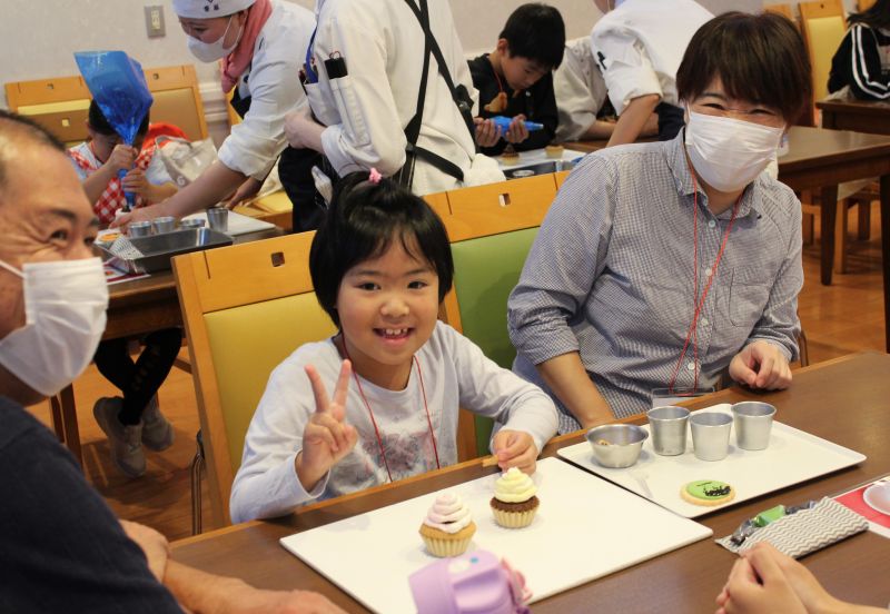 ハロウィンではおなじみのジャック・オー・ランタンの顔をクッキーに描き、抹茶とイチゴのクリームのカップケーキを完成させた小学3年生の佐久間亞希さんは母と一緒に参加。「楽しかった。大きくなって、こんな学校に通うのもいいかな」。叔母と参加した小学1年生の山路泰輝さんは「クリームを絞るのがちょっと難しかったけど、楽しかった」と話した。