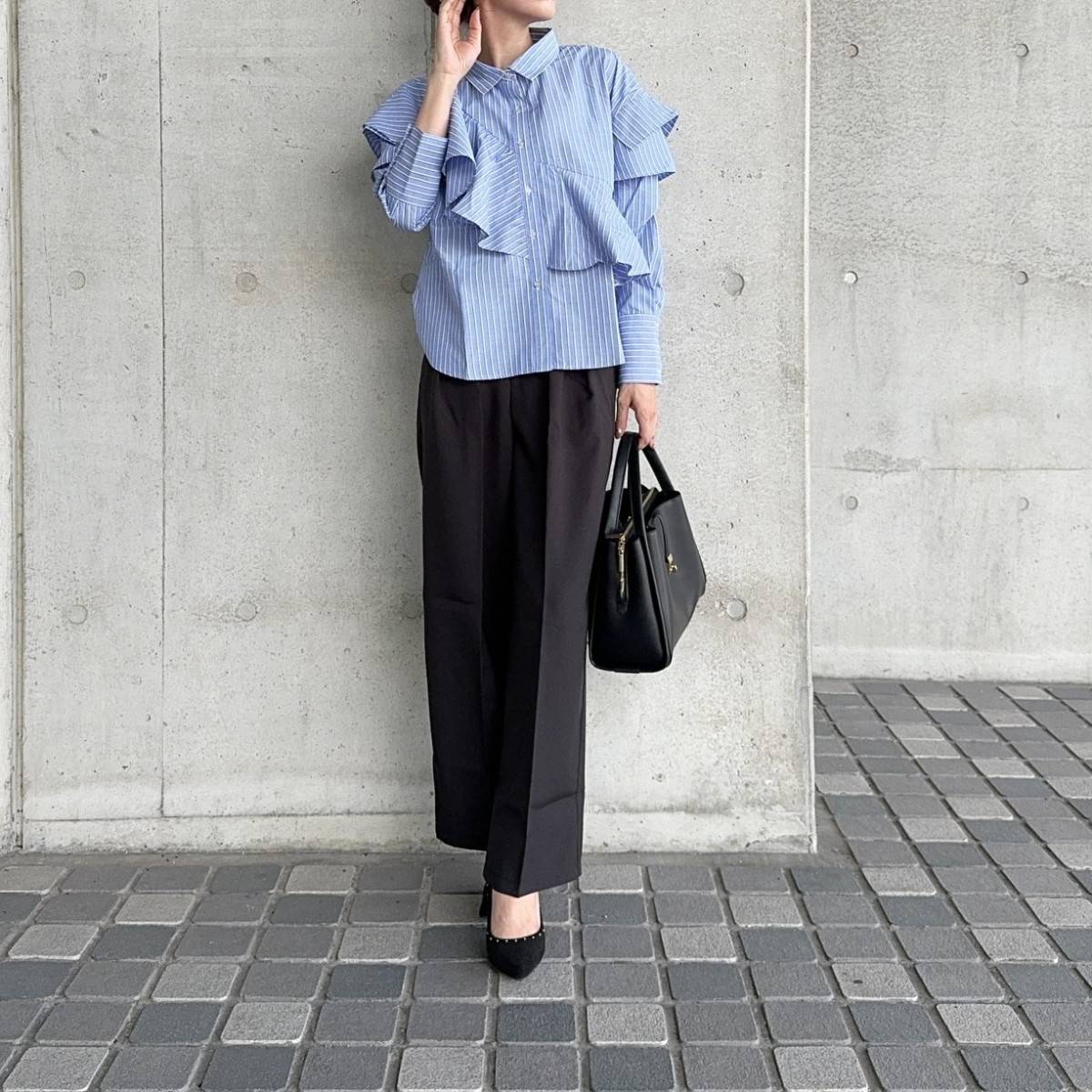 ブルーのストライプ柄のブラウスはクールに見えがちですが、大きめフリルが目を引くデザインを選ぶと、大人っぽく華やかな印象になります。
