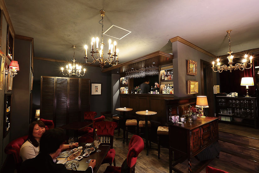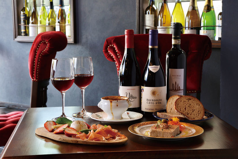 料理と一緒はもちろん、お酒だけでも楽しめることを意識した品ぞろえ。本格的なブルゴーニュワインやカリフォルニアワインをはじめ、世界各国のワインがならぶほか、ウイスキーはアイラ系を中心に揃います。