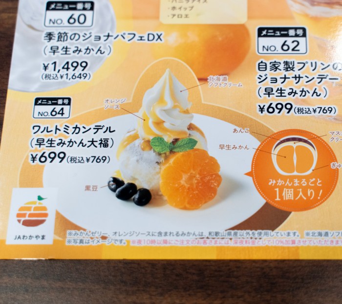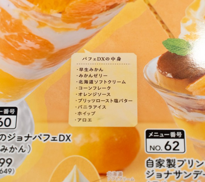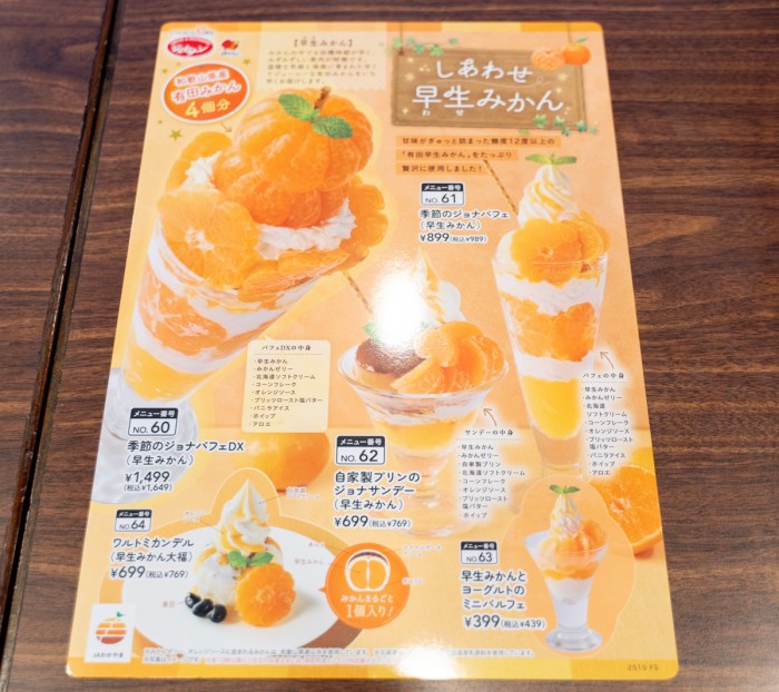 つまり選択肢は1つ。デカい「季節のジョナパフェDX(早生みかん)」だ! 値段は1649円。