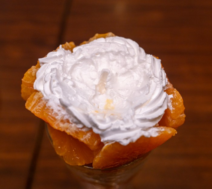 みかんの下は、たっぷりの生クリーム! この中にはバニラアイスが隠れている。