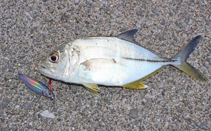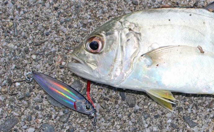 最初の数投はメッキの姿が見られなかったが、小さなベイトがいたため実績のあるポイントを攻めた。すると、フォール中にコツーンと何かヒットした。メッキにしては馬力が弱く、小さなセイゴと思っていたら15cm級のマアジだった。