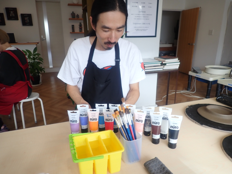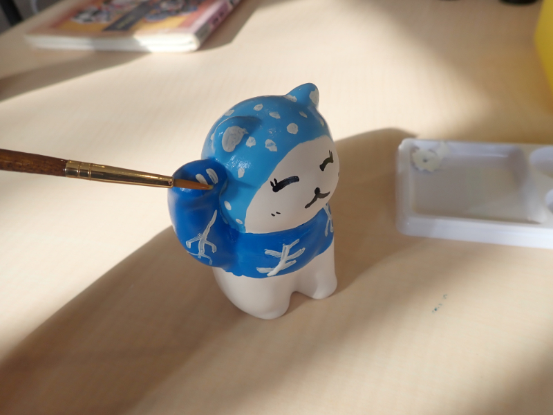 絵付け体験にも挑戦しました。絵付けは、素焼きの作品に速乾性の水性絵の具で模様や色を付けます。