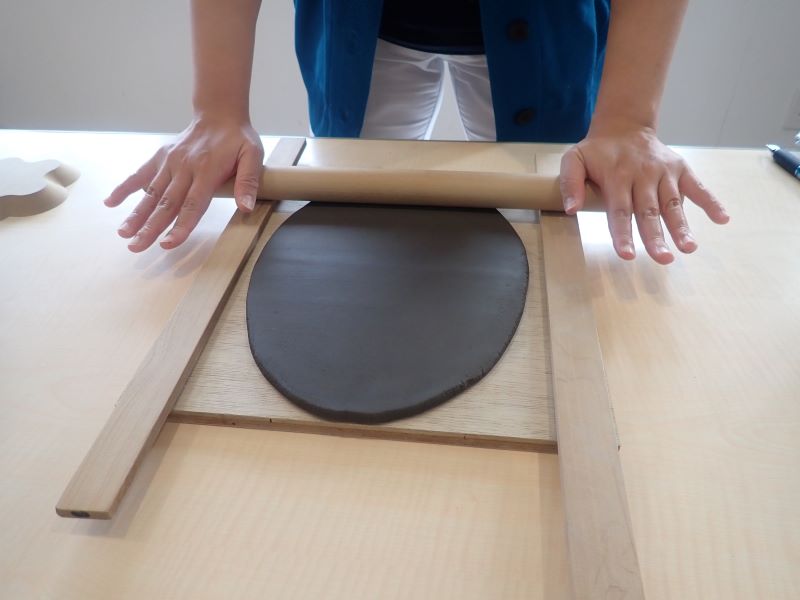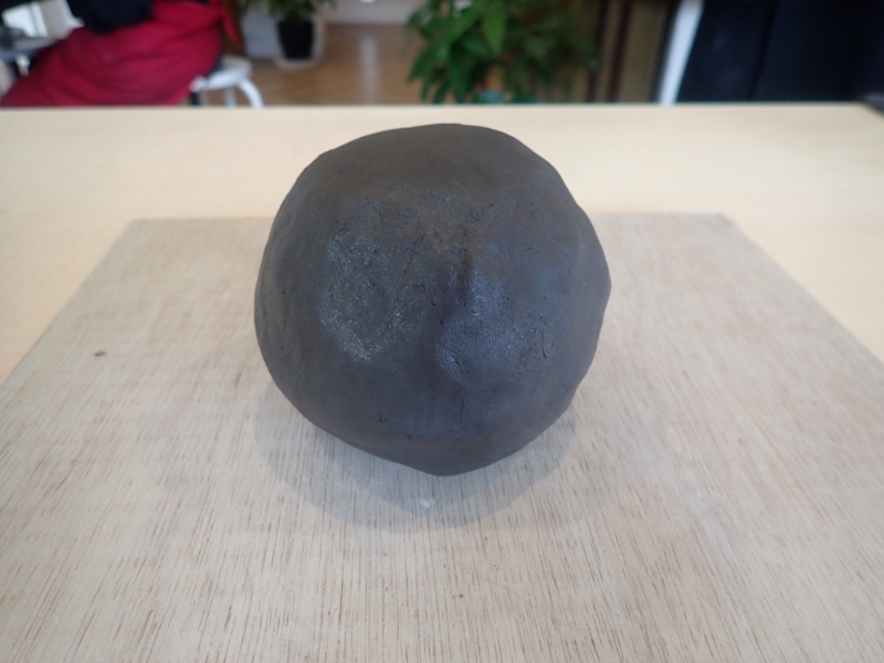 粘土は、球体の塊の状態でスタートします。球体の状態からひたすら手のひらでたたいてたたいて、最後はローラーを使って平らにします。