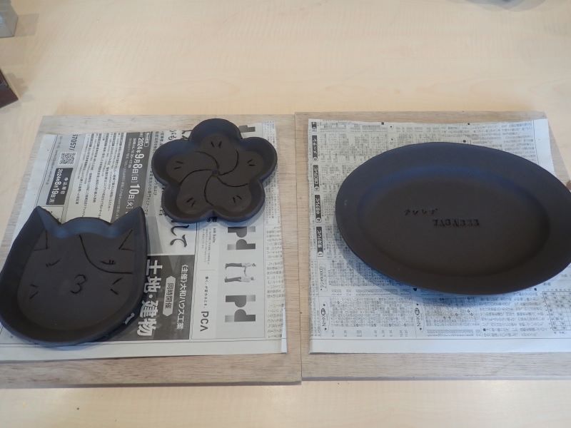 ほか2種類の型も、同じように粘土をたたいて平らにし、型に沿わせて余分な箇所を切り落としました。