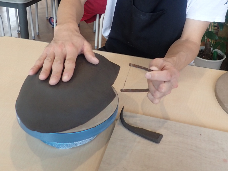 平らにしたら、型の出番です。粘土を型に沿わせて、余分な箇所を落とします。