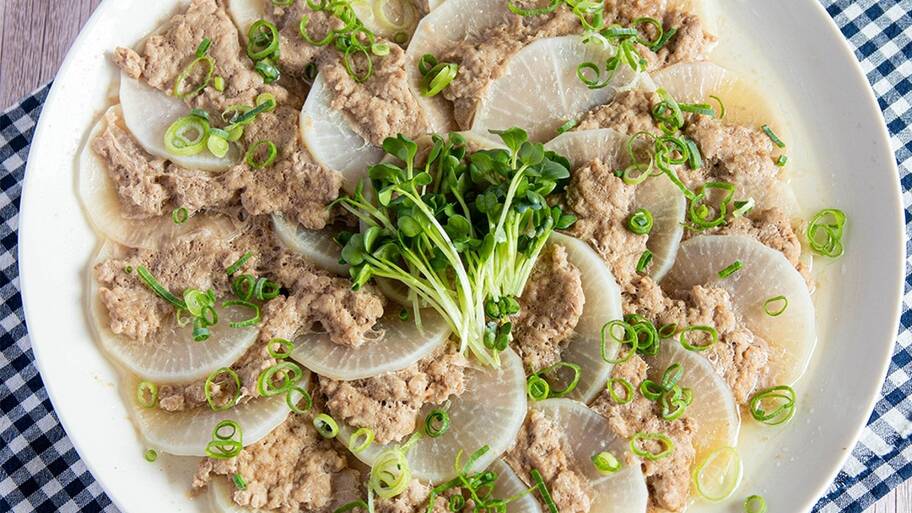① ほうれん草はラップで包み、耐熱皿にのせて600Wの電子レンジで2分加熱する。水にさらし、水気を絞って5センチの長さに切る。