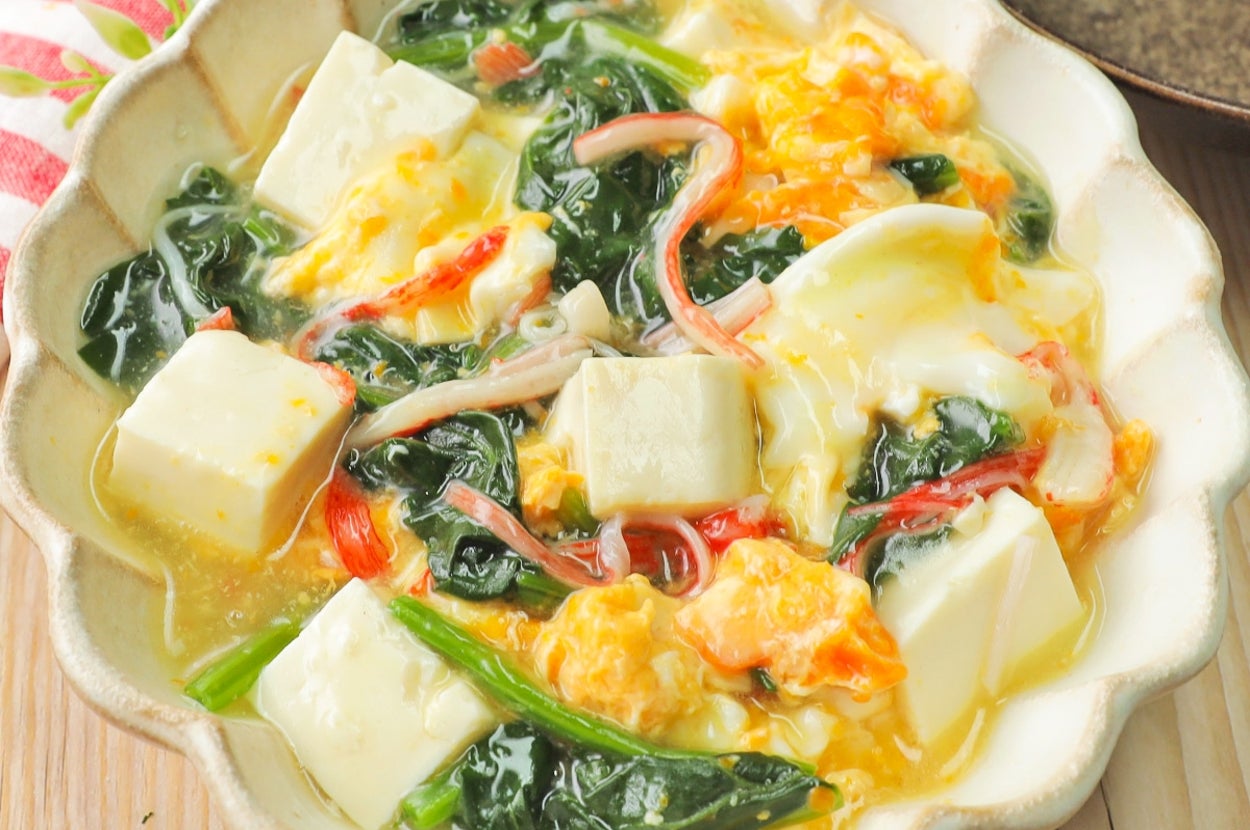 豆腐とほうれん草を卵あんでとろ〜っと煮込んだ、「ほうれん草と豆腐の卵あんかけ」のレシピをご紹介します。