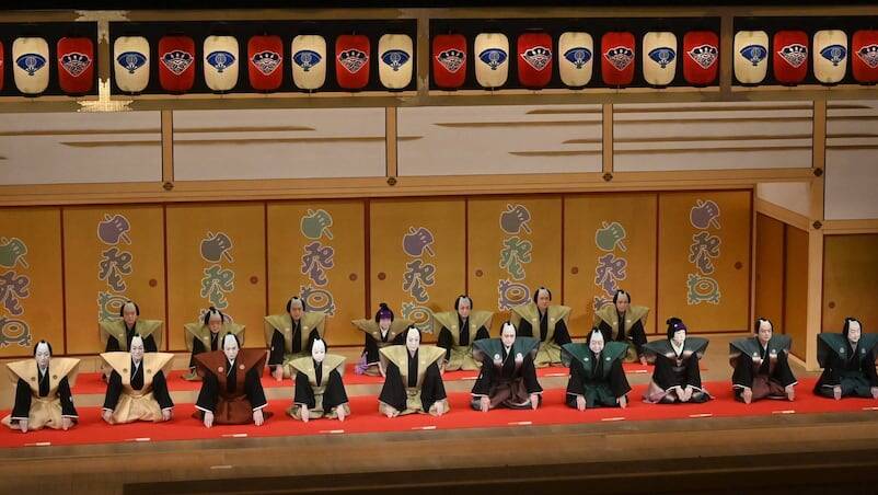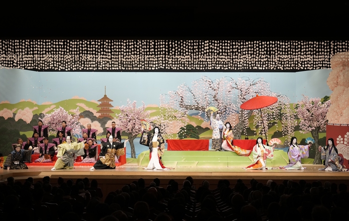 昼の部の幕開けを飾ったのは『醍醐の花見』。ご当地・京都は醍醐寺で豊臣秀吉が催した一世一代の宴を題材とした演目。中村鴈治郎演じる豊臣秀吉、中村扇雀演じる北の政所をはじめとした一同が、桜を愛でながら次々に舞い踊る。歴史上の人物たちが居並び、満開の桜が咲き誇る舞台に、会場は華やかな雰囲気に包まれた。