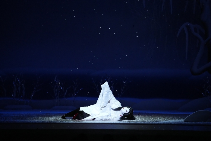 続く『鷺娘』は八代目尾上菊五郎の襲名披露狂言。一転して銀世界の厳かな雰囲気の中、白無垢姿で現れた菊五郎扮する鷺の精は、恋の苦楽を踊る。やがて激しい雪の中、恋の責め苦に苛まれ妄執を見せる姿に、会場全体が圧倒され、惜しみない拍手が送られた。
