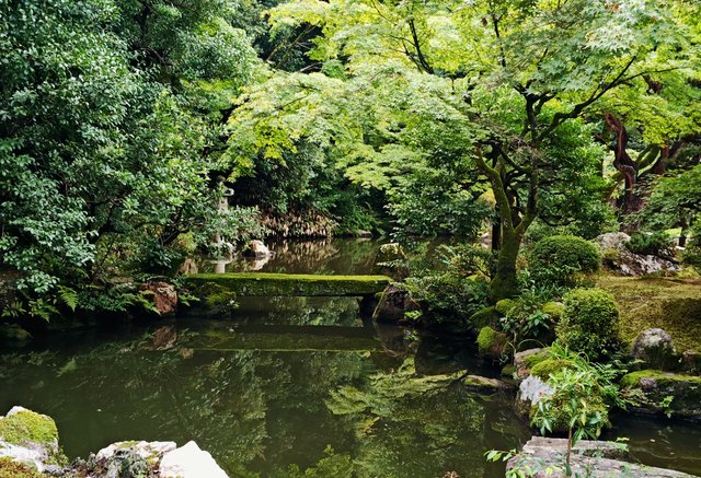 小径の両側に広がるのは東山の湧水を引き入れた池泉庭園と枯山水庭園。