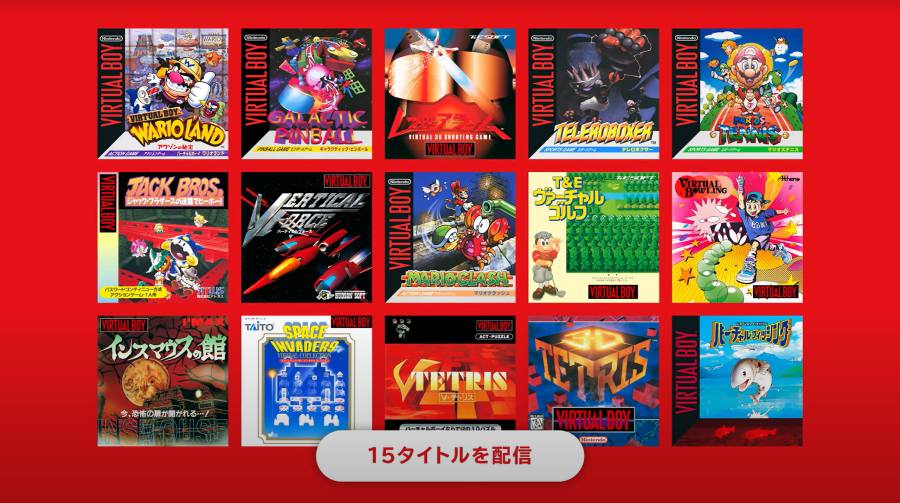 配信されるタイトルはローンチタイトルでもあった「マリオズテニス」をはじめ、「ワリオランド」「バーチャルボーイゴルフ」「マリオクラッシュ」「ジャック・ブラザーズの迷路でヒーホー!」など、15タイトルを予定。