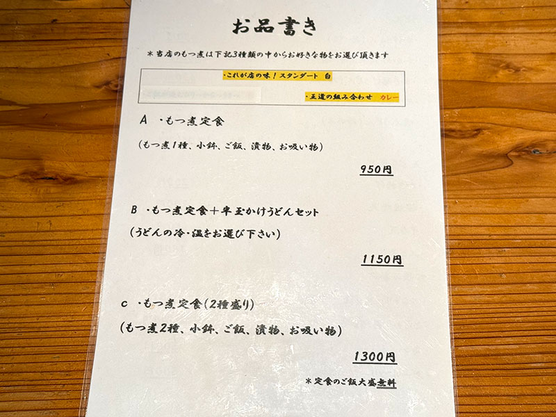 喰心坊のランチメニュー、もつ煮は定番の「白」か「カレー」の味付けから選べます。