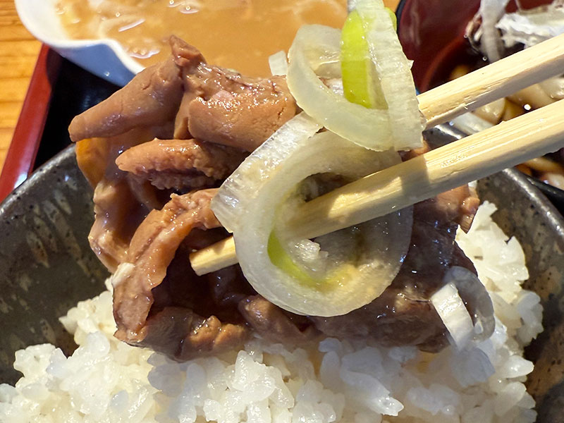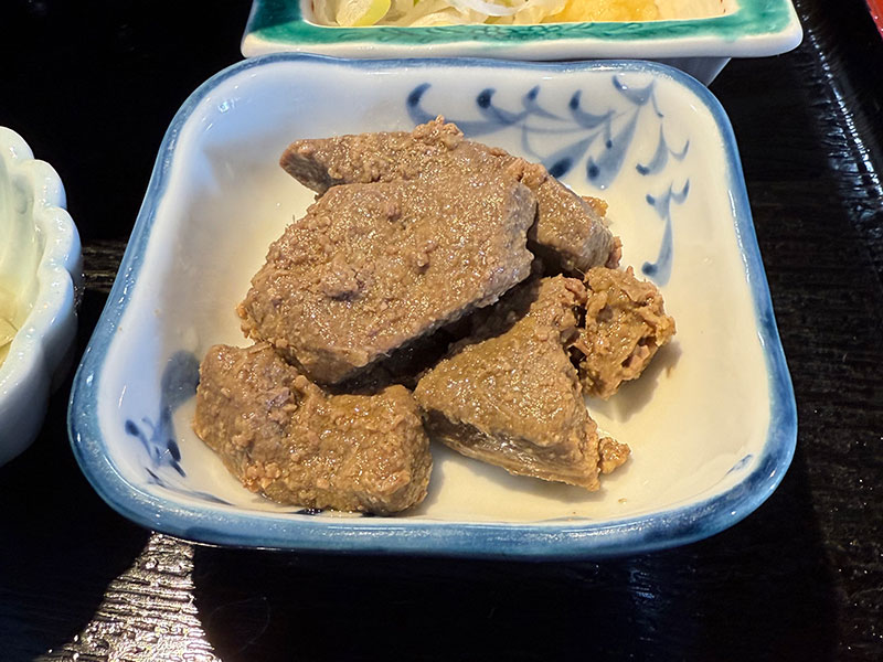 もつ煮定食に付いてくるレバーのショウガ煮は、もつと同じく新鮮な状態で入荷するので、臭みがなくてめちゃくちゃおいしい! 豚一頭買いの強みですね。
