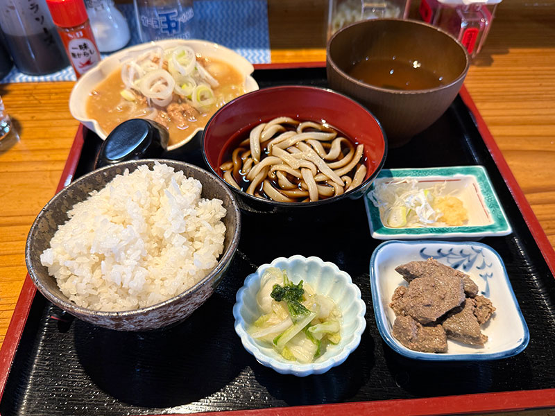 「もつ煮定食と半玉かけうどんセット(1150円)」は、お店イチオシのもつ煮定食とうどんがセットになった、大満足のメニュー。