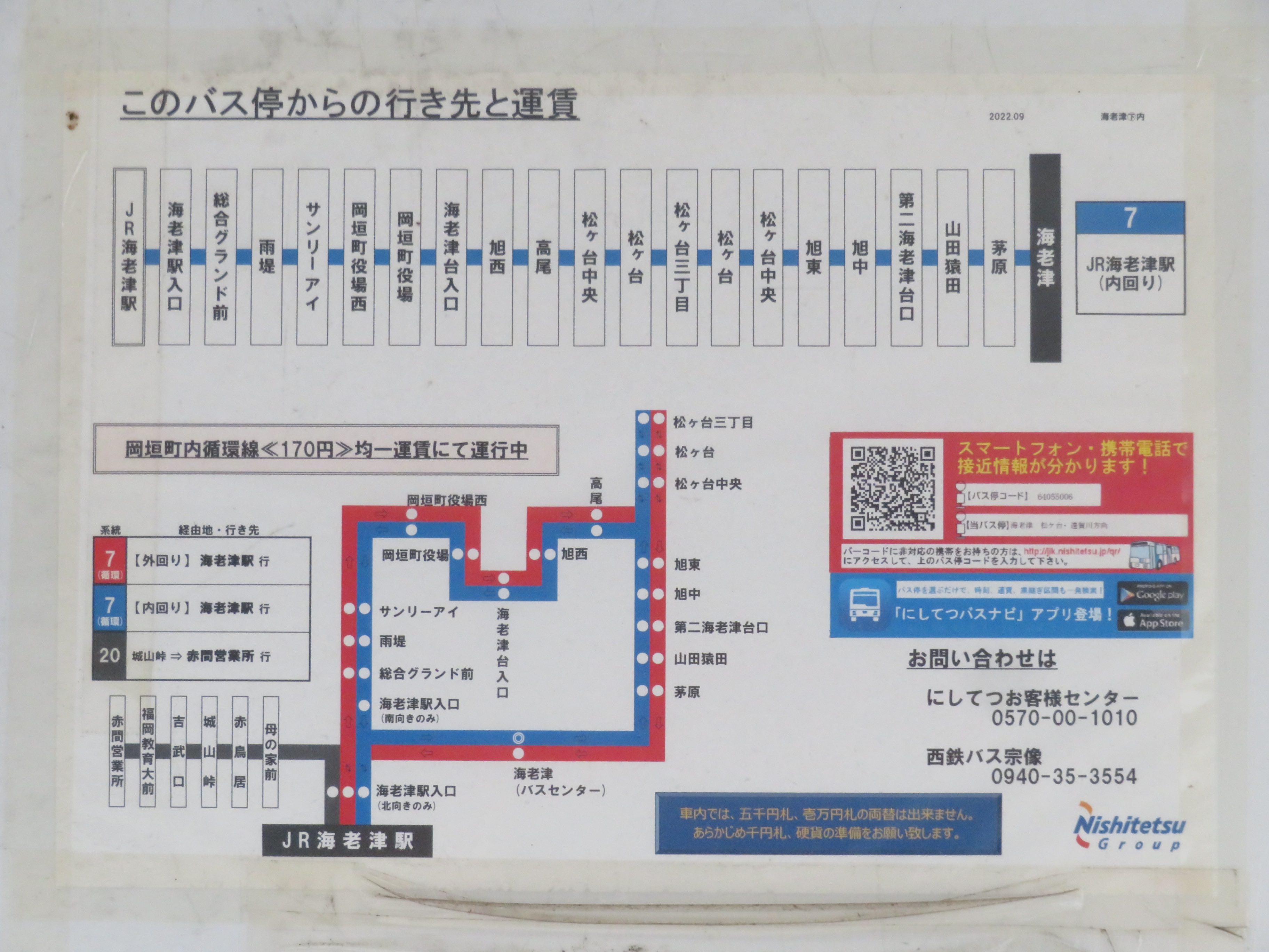 【STEP2】「JR海老津駅」バス停から、7番 旭東経由 松ケ台・役場方面ゆきに乗車。約2分、170円。