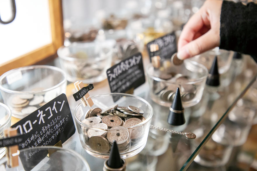 約50カ国のヴィンテージコインから、生まれ年や記念日、旅した国など特別な一枚をセレクト。コインに穴を開けたり広げたりして、リングやネックレスが作れる「I.BE LABO」。
