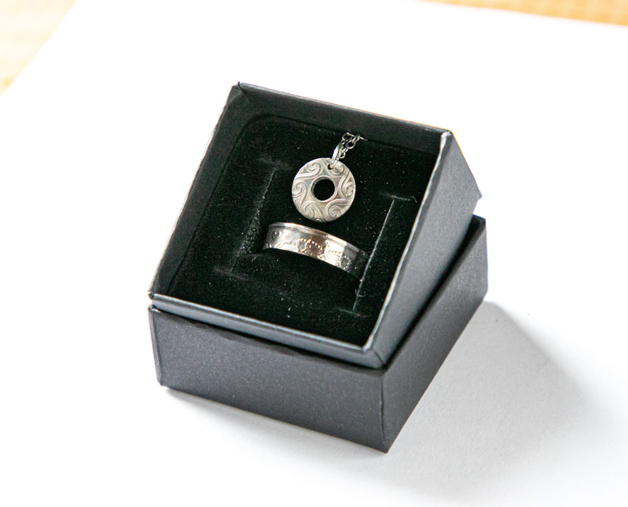 くり抜いたコインの外側がリングに、中央がネックレスに♡