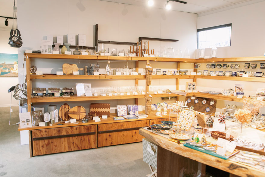 店内には、工務店の職人が木とレジンで作る壁掛け時計や、ヨーロッパの雑貨も並びます。ご主人作の棚には、カップ&ソーサーやポットなど多彩な器が。奥には貸しギャラリーもあります。