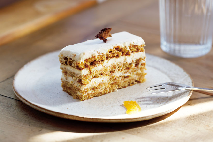 昔ながらの作り方を再現した「はちみつケーキ」の隣には、ラトビア産はちみつを味わってほしいと、はちみつを一口サイズで添えています。