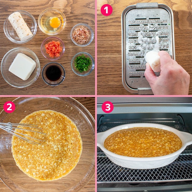 ③ トースターで約12〜15分表面がふんわり膨らみ、軽く焼き色がつくまで焼く。仕上げに取り分けておいた明太子を上にのせ、かつお節と小ねぎを散らしたら、完成!