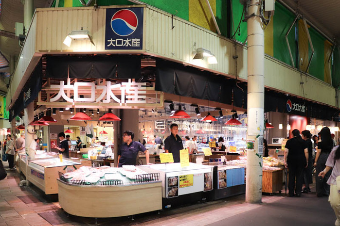 近江町市場の中心にある、「大口水産」は、 新鮮魚介と加工品が揃う人気店。