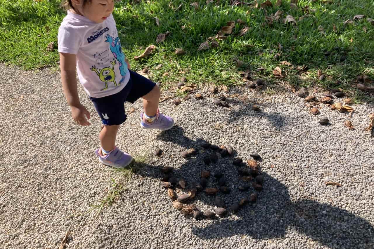完成した!と思ったのもつかの間。速攻ではじまる怪獣ごっこ。木の実集め大変だったのに…と嘆くママを気にもせず、儚く散っていく木の実アート。まさに創造&破壊のアートで芸術の秋を満喫しました。秋の公園には落ち葉や木の実などもたくさん落ちているのでぜひ探してみてください。