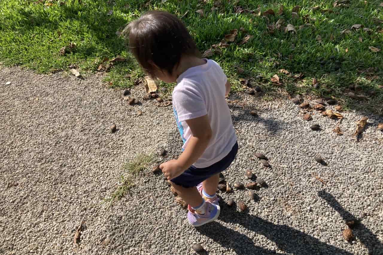 公園の敷地にはコバテイシ(モモタマナ)と呼ばれる街路樹が植えられていて、芝生広場横にあるコバテイシの木の周りには木の実がたくさん落ちていました。