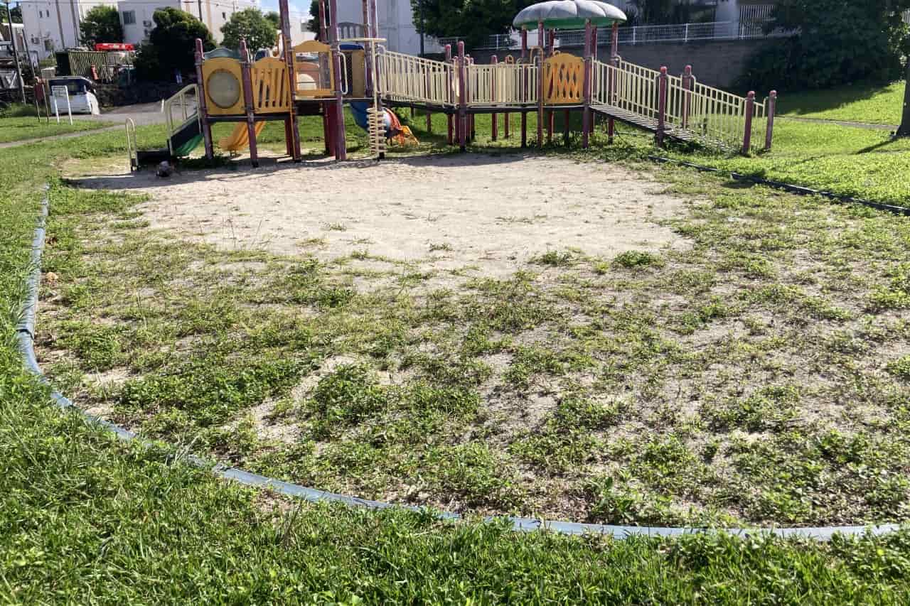 遊具のエリアの地面は砂場になっており、お砂遊びもできるのもポイント!ただ、遊具の周り以外は芝生が侵食してきており、遊べそうにありませんでした。植物の生命力はすごいですね!