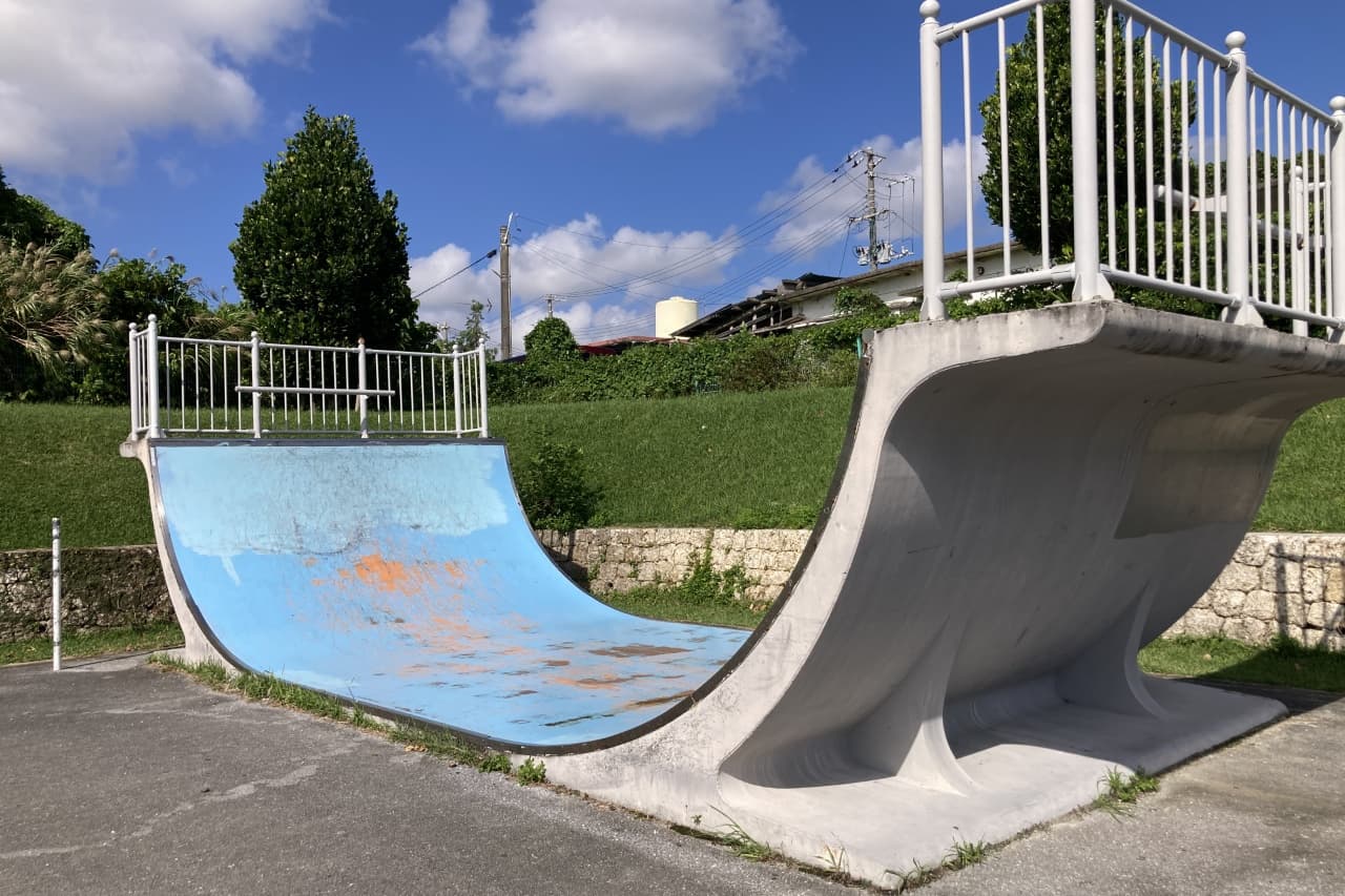 バスケコートの反対側はかなり広めのスケボーパークになっています。端にはそれぞれ「セクション」と呼ばれるトリックやスキルを試す構造物が設置されており超本格的!もともと沖縄の中部はストリートスポーツが根付いており、スケボーパークのある公園も多くありますが、混み合っている印象でした。しかし、白川公園のパークは週末なのにあまり人がいなかったので、もしかしたら穴場かも?!