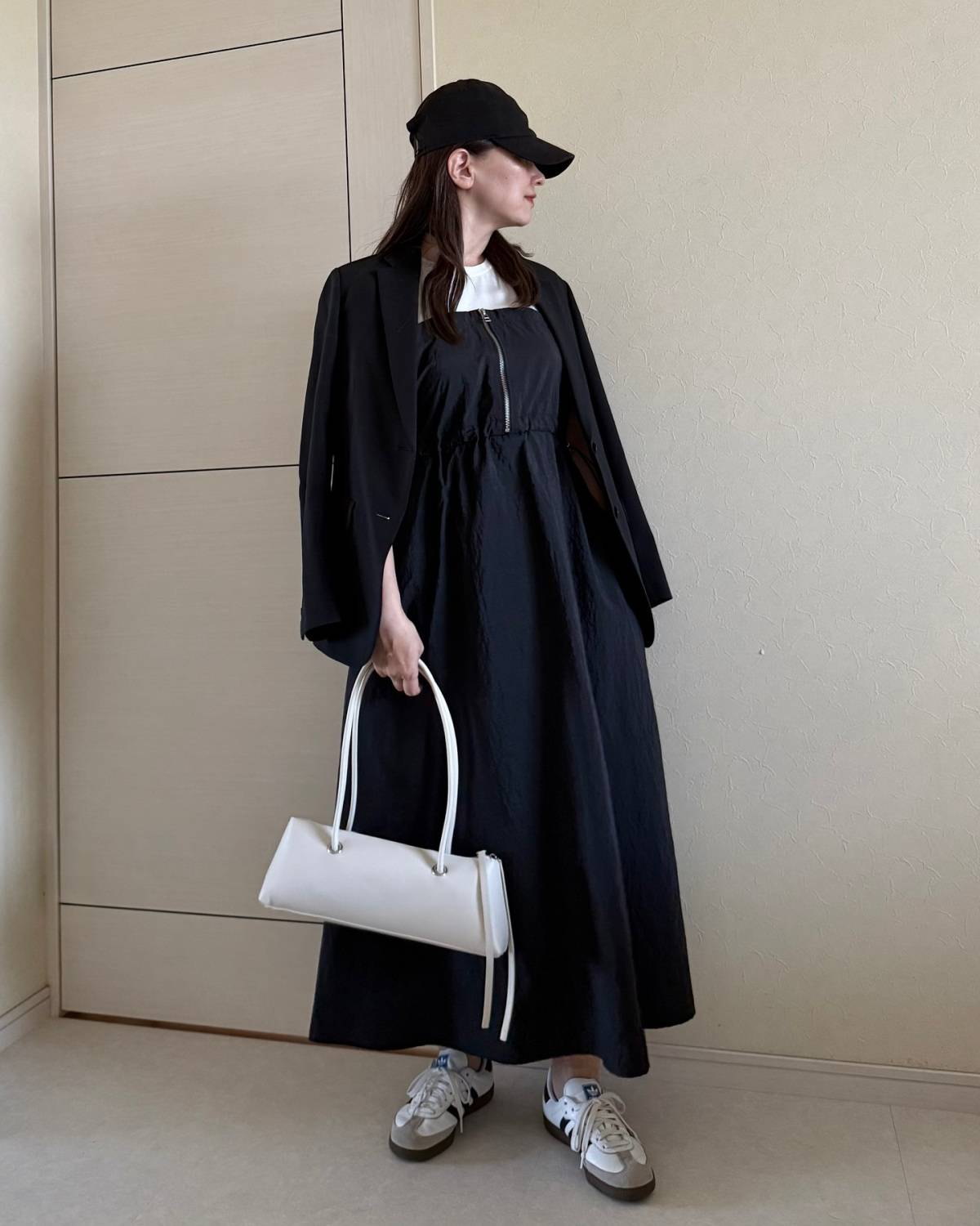 【11月編】老け見えしない黒ワンピースコーデ①キャップ×ジャケット肩掛けのMIXコーデ