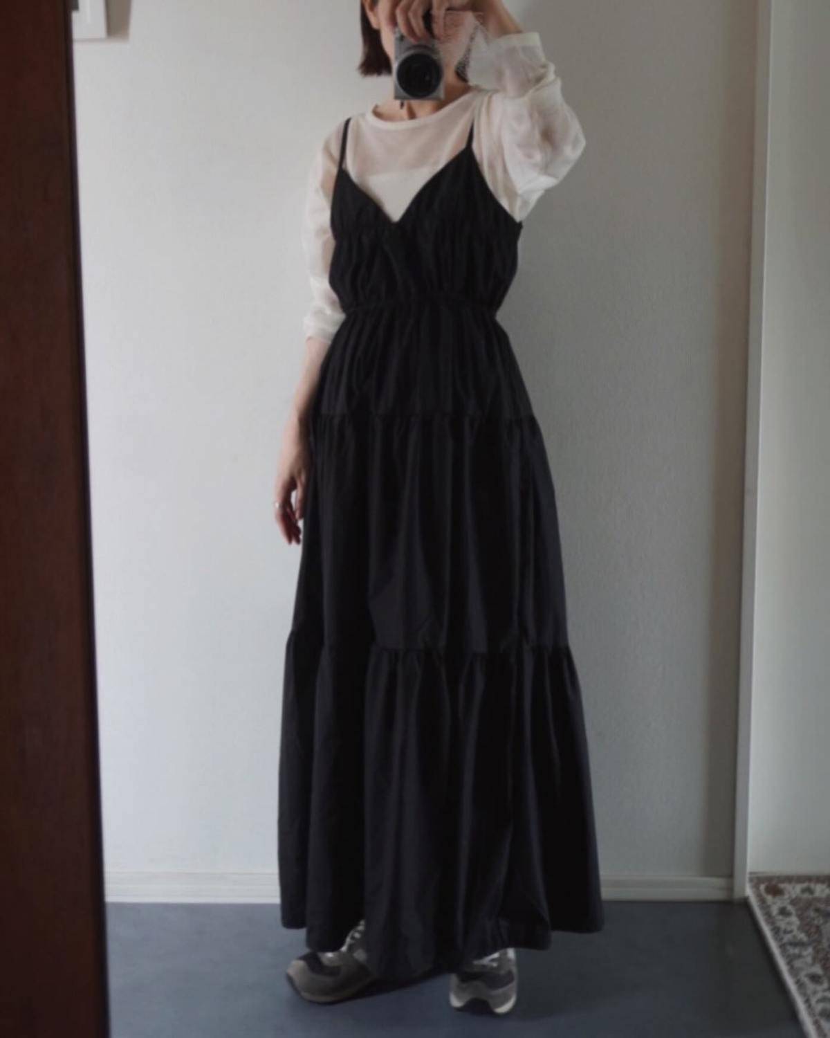 胸元の深めのカットが特徴のキャミソールタイプの黒ワンピースは、いろんなレイヤードコーデを楽しめる万能アイテム♡