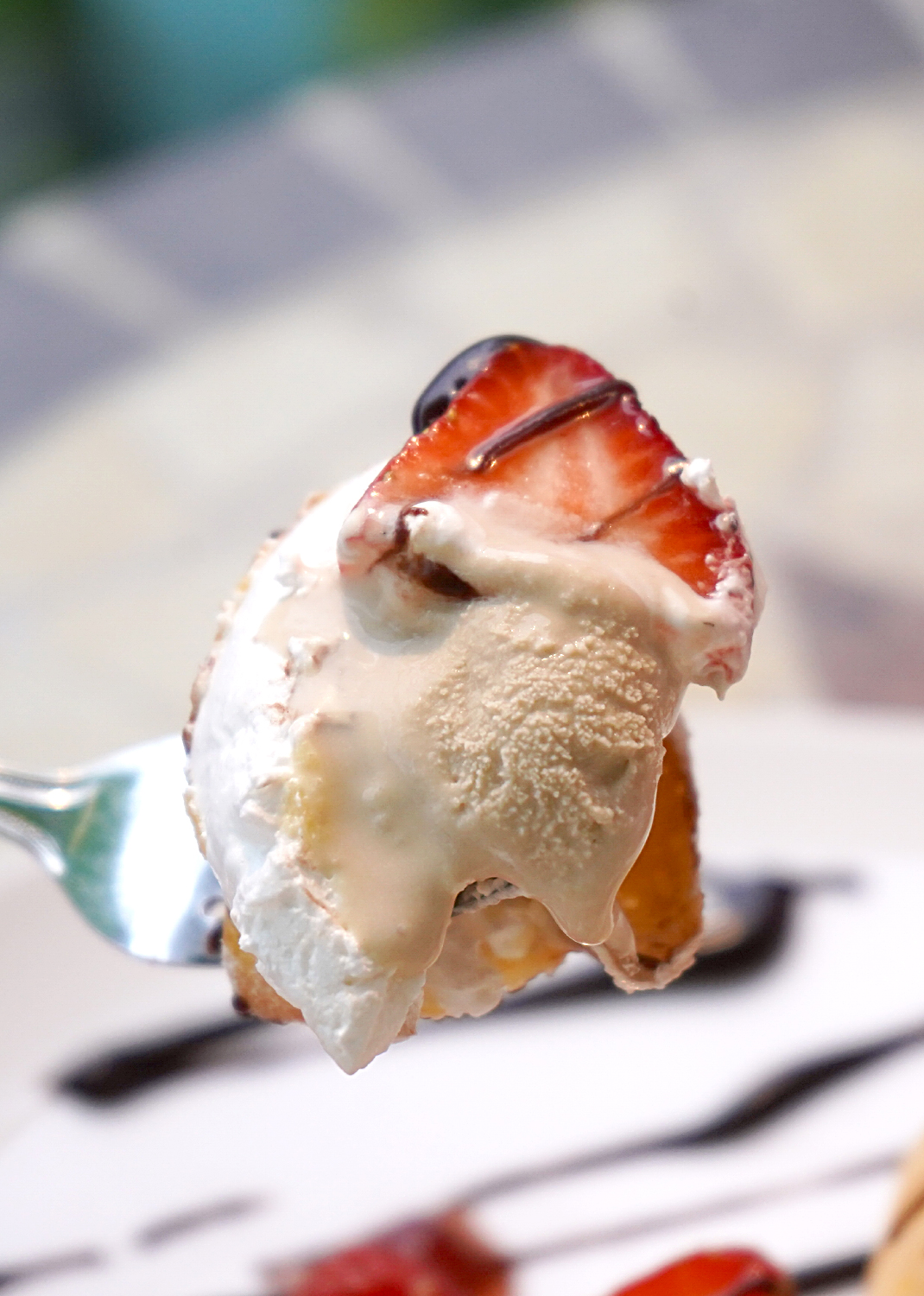 クレープ、イチゴ、チョコ、アイスとそれぞれの味を確かめつつ、ひと口ずつ組み合わせを変えながら食べ進めるのがこれまた楽しい。
