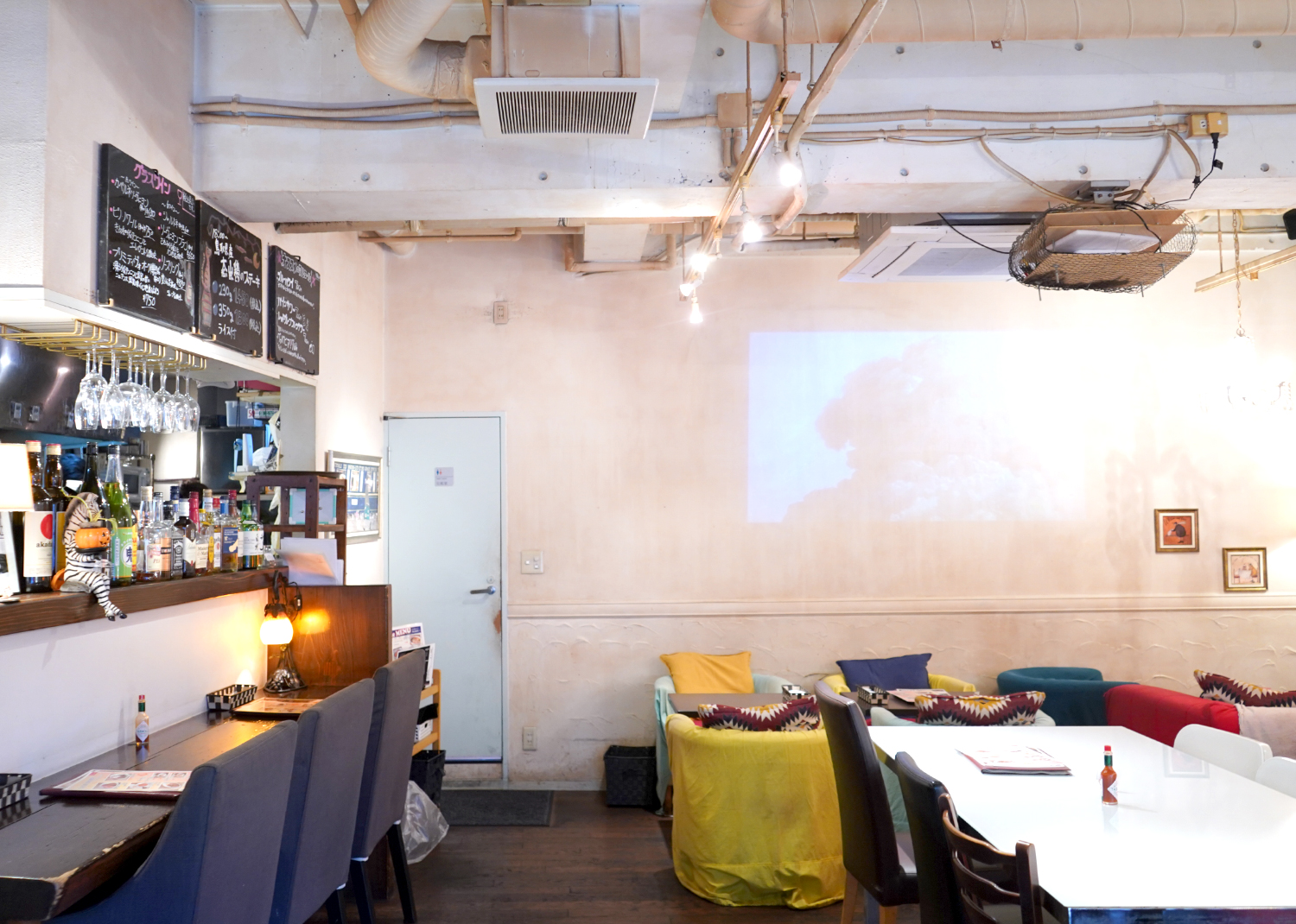 カラフルなアジアンテイストの席、レトロで落ち着く壁際の席、アメリカンテイストな中央席、おひとり様でも静かに過ごせるカウンター席と、座る位置で異なる世界観へと引き込まれる。