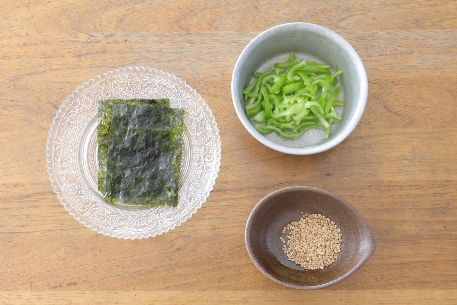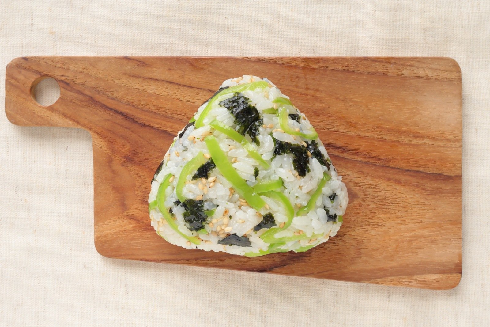 おにぎりの具材に使うのは、風味豊かな「韓国海苔」と「ごま」。そして、βカロテンやビタミンCなどに定評がある「ピーマン」です。いずれも白米と相性がよく、3つの食材が合わさることでお子さんにも食べやすい味わいに仕上がります。