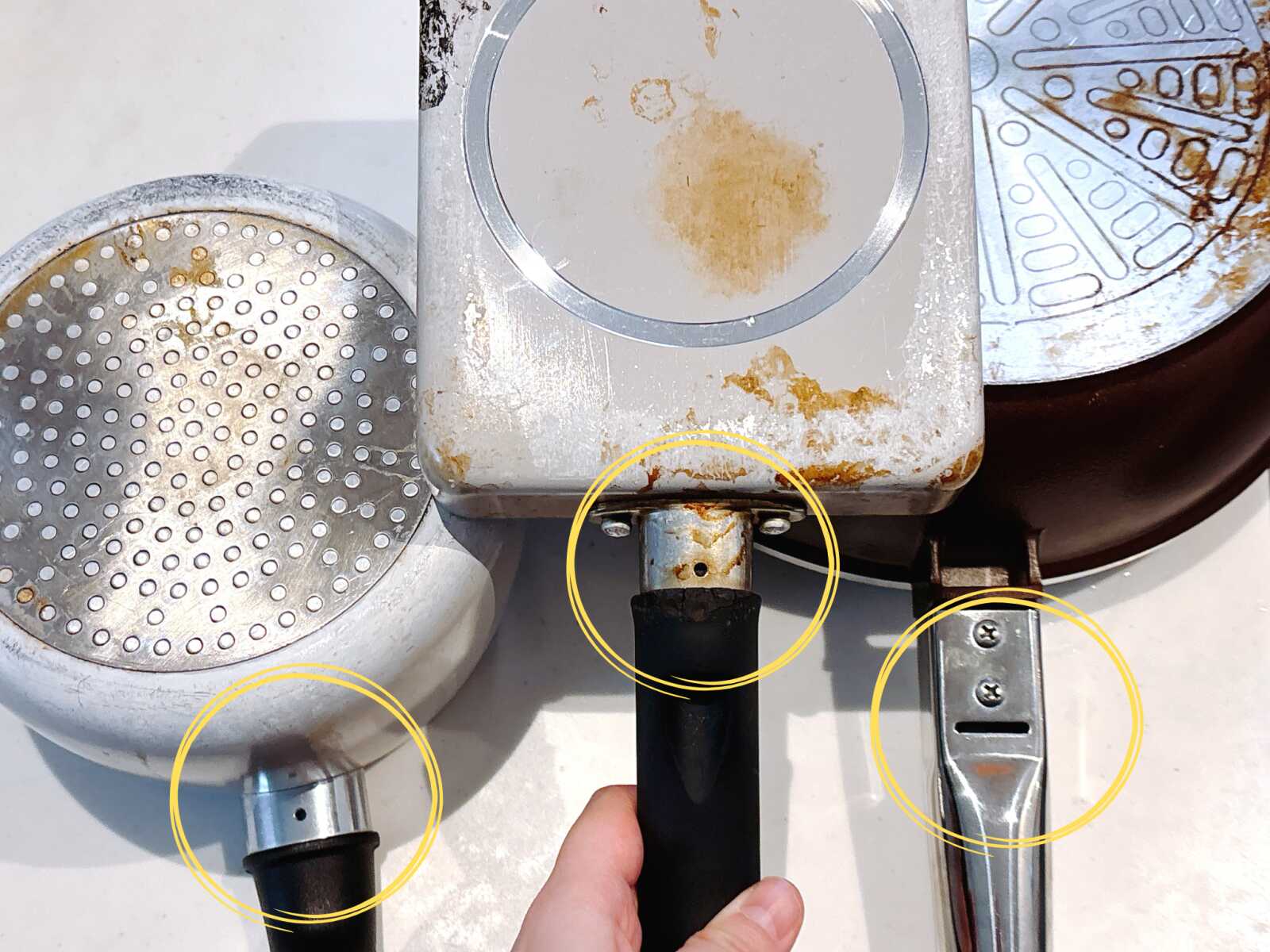小さな穴があるのは、ハンドル内が空洞で水や空気が溜まる恐れのある構造のフライパンのみです。わが家のフライパンや鍋をチェックしてみましたが、穴が開いているタイプは全部で5個もありました。